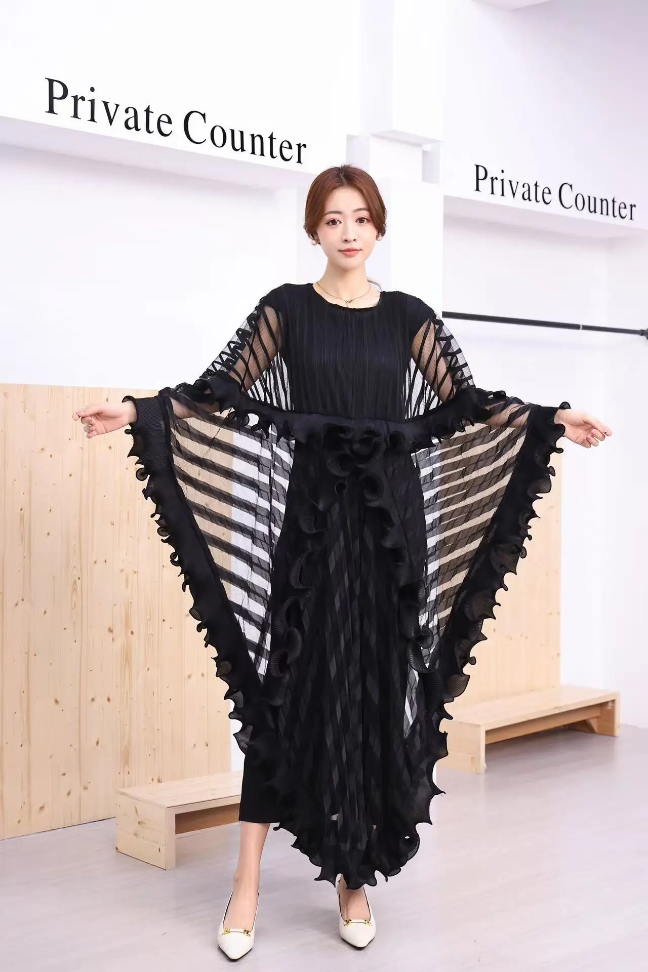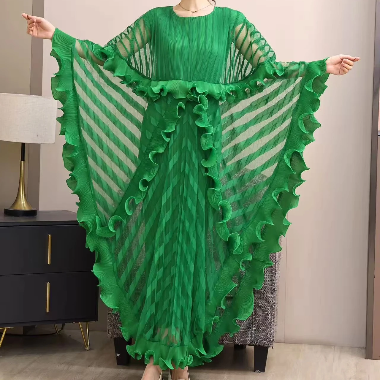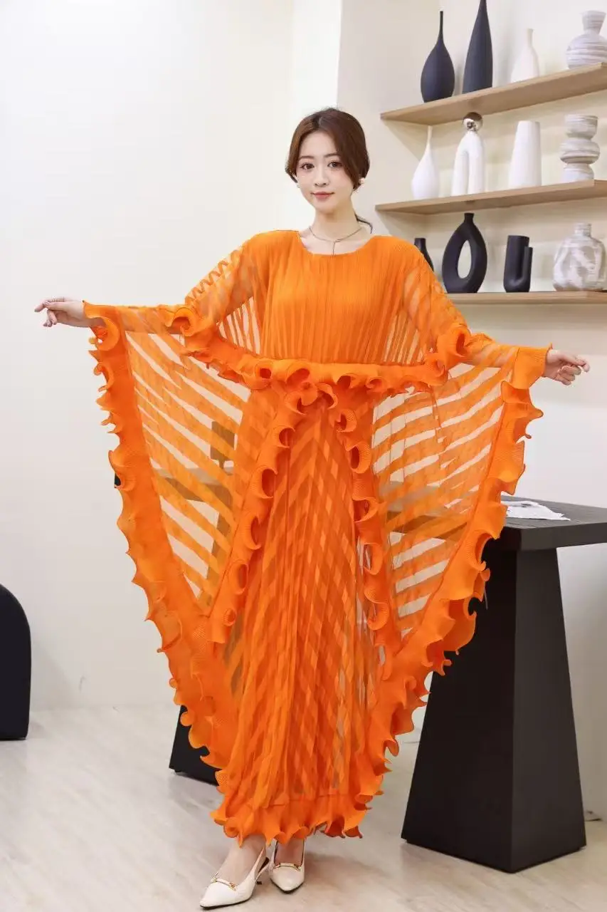 Hot Selling Solid Color Pleated Batwing Sheer Layer Sleeves Casual for Fat Ladies Fashion Summer African Miyakie Pleated Dresses